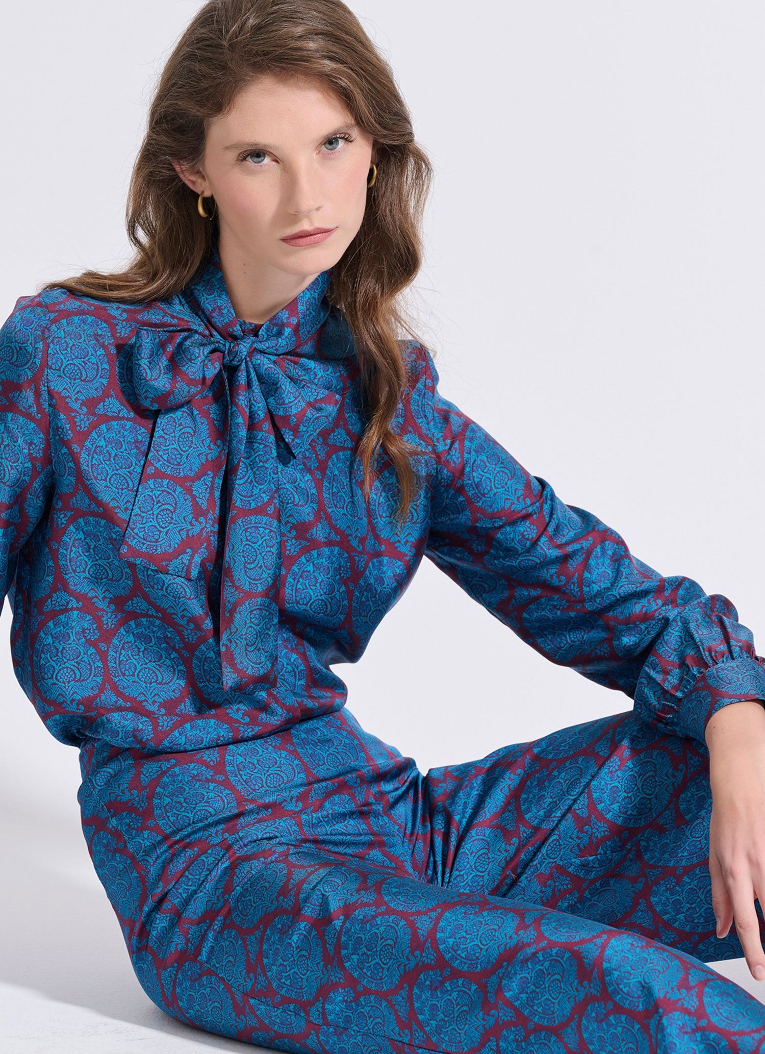 Seasonal collection of exclusively printed, pure silk shirts and blouses in jewel like tones.