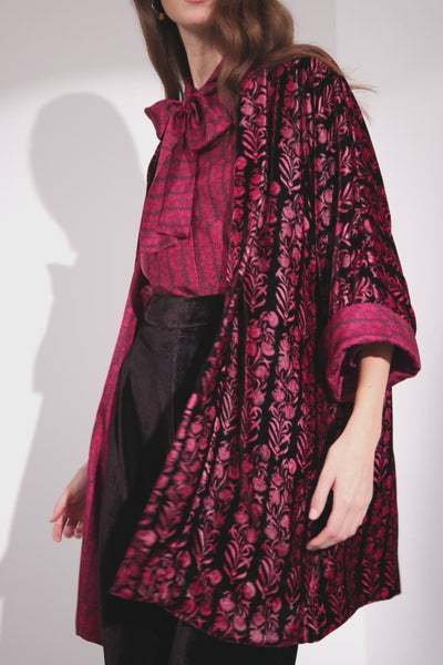 Reversible kimono in 100% fine silk twill and velvet. Loose fit with three quarter turnup sleeves revealing the contrasting fabric and held up with a button. Style with our SARITA velvet trousers for an elegant evening look.