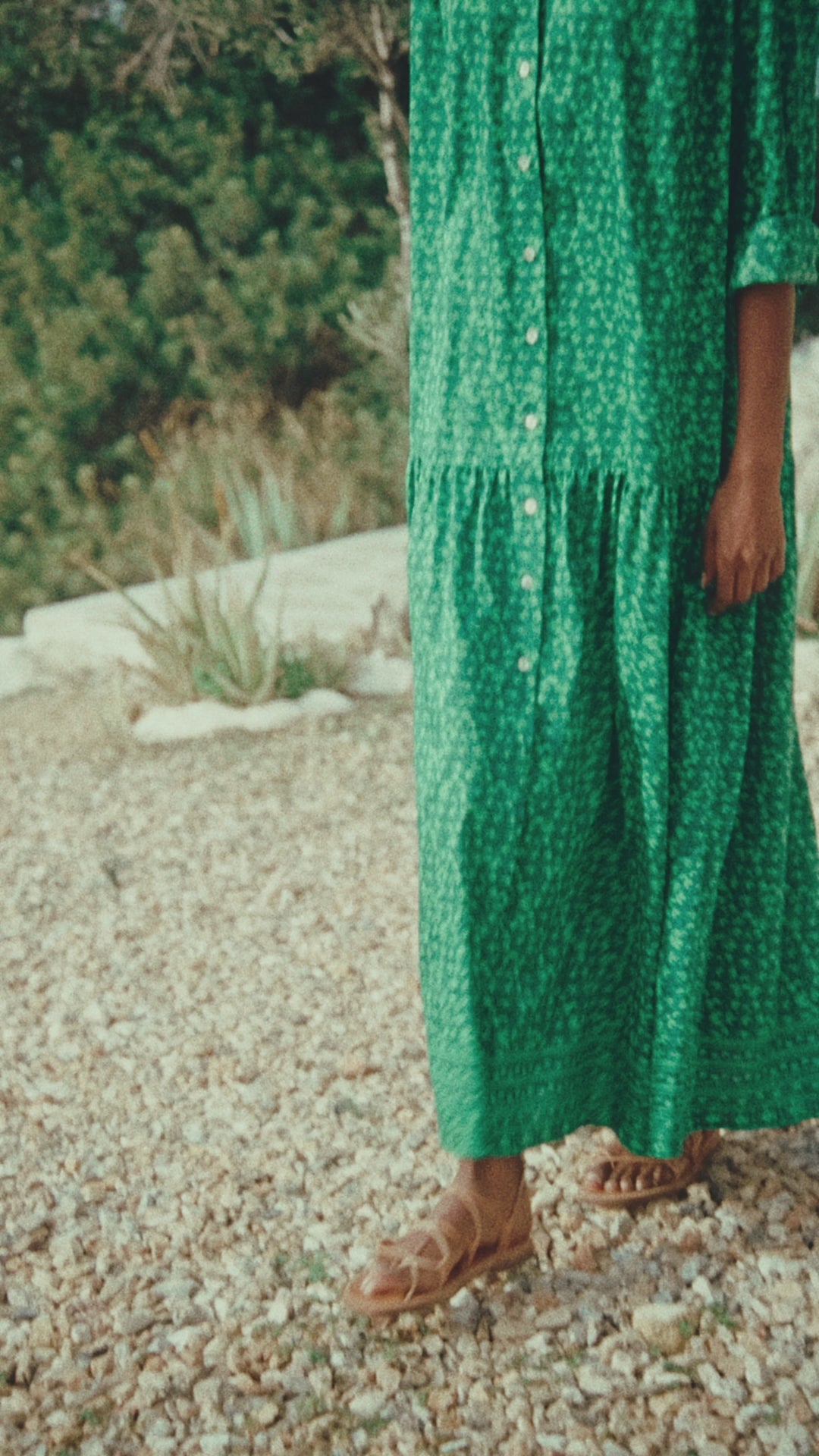100% cotton one-size dress with small green floral print, slightly contrasted by fine stripes on the collar, cuffs and hem. This full and flowing shirt dress fastens with mother-of-pearl buttons all the way down.