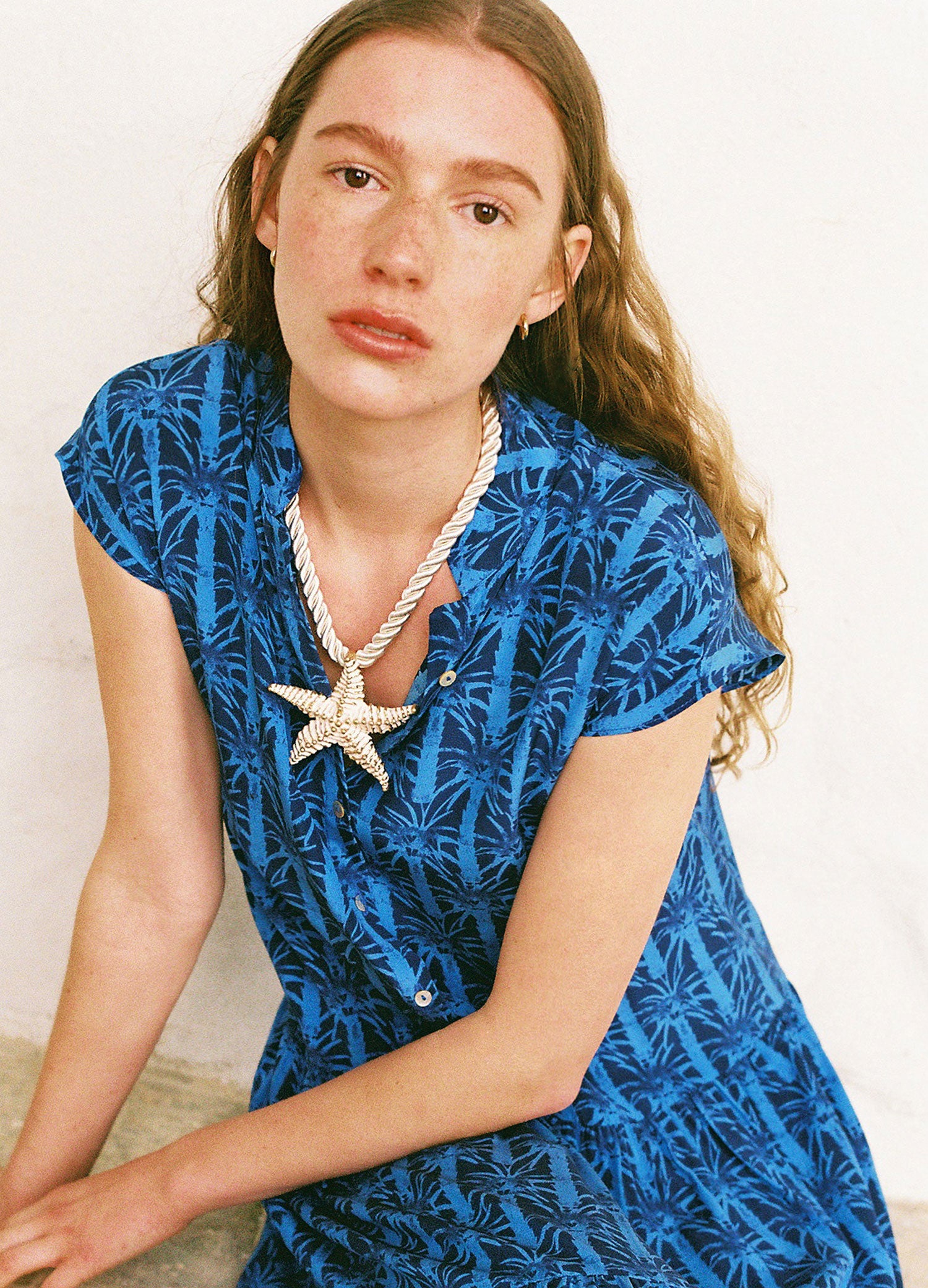 Crafted from 100% silk in a coral-toned floral, this halterneck maxi dress is designed to captivate. Wide straps cross elegantly at the front and wrap around the neck, held in place by a sculptural, gold-plated shell jewel, custom-made by Alveare Jewelry. The bare back and bias-cut skirt complete the fluid, waist-defining silhouette.