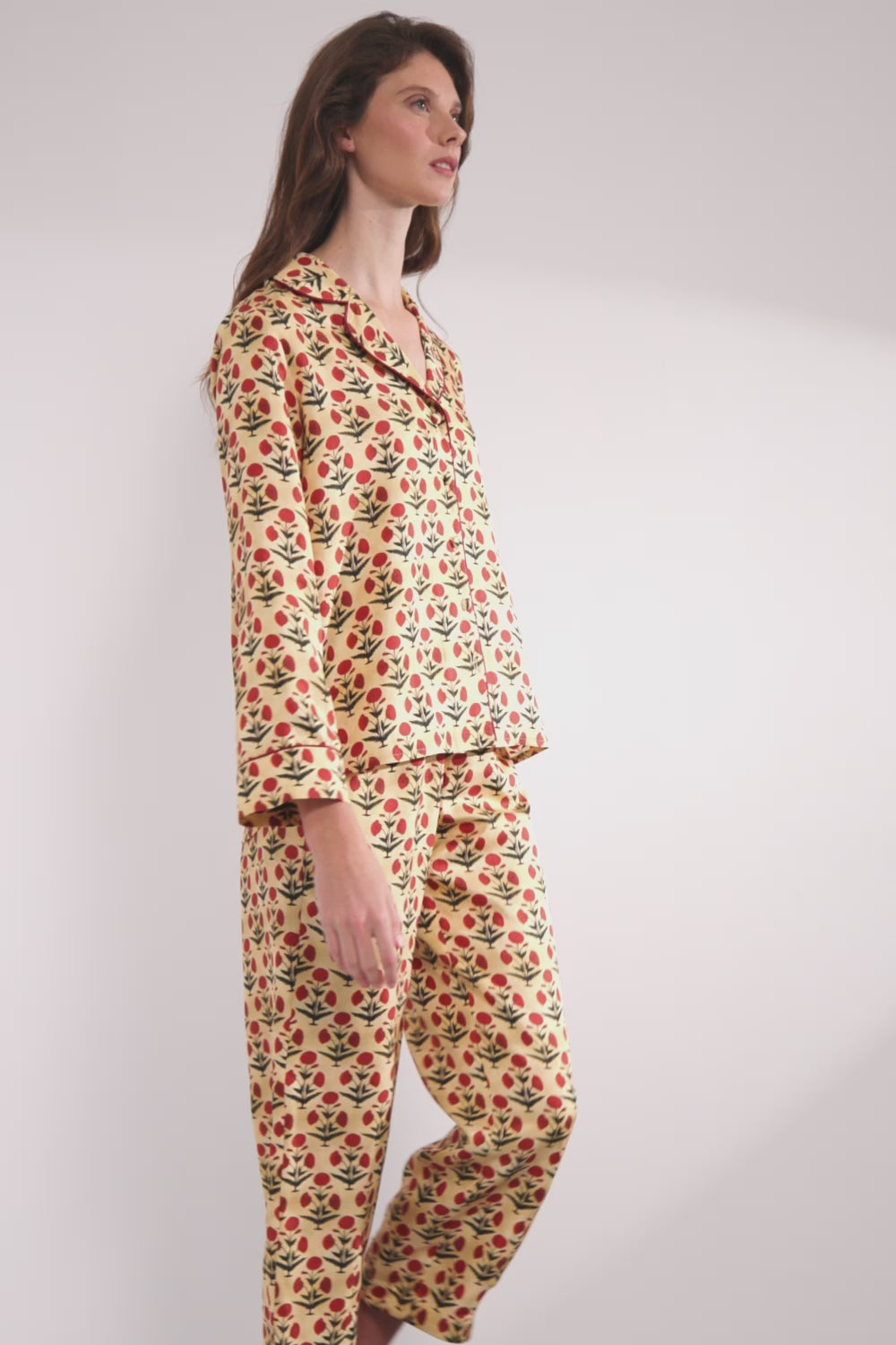 100% silk twill printed shirt with piping detail in a contrasting colour around the lapels, pocket and cuffs. Tailored fit with matching covered buttons. Complete the look with our matching silk pants.